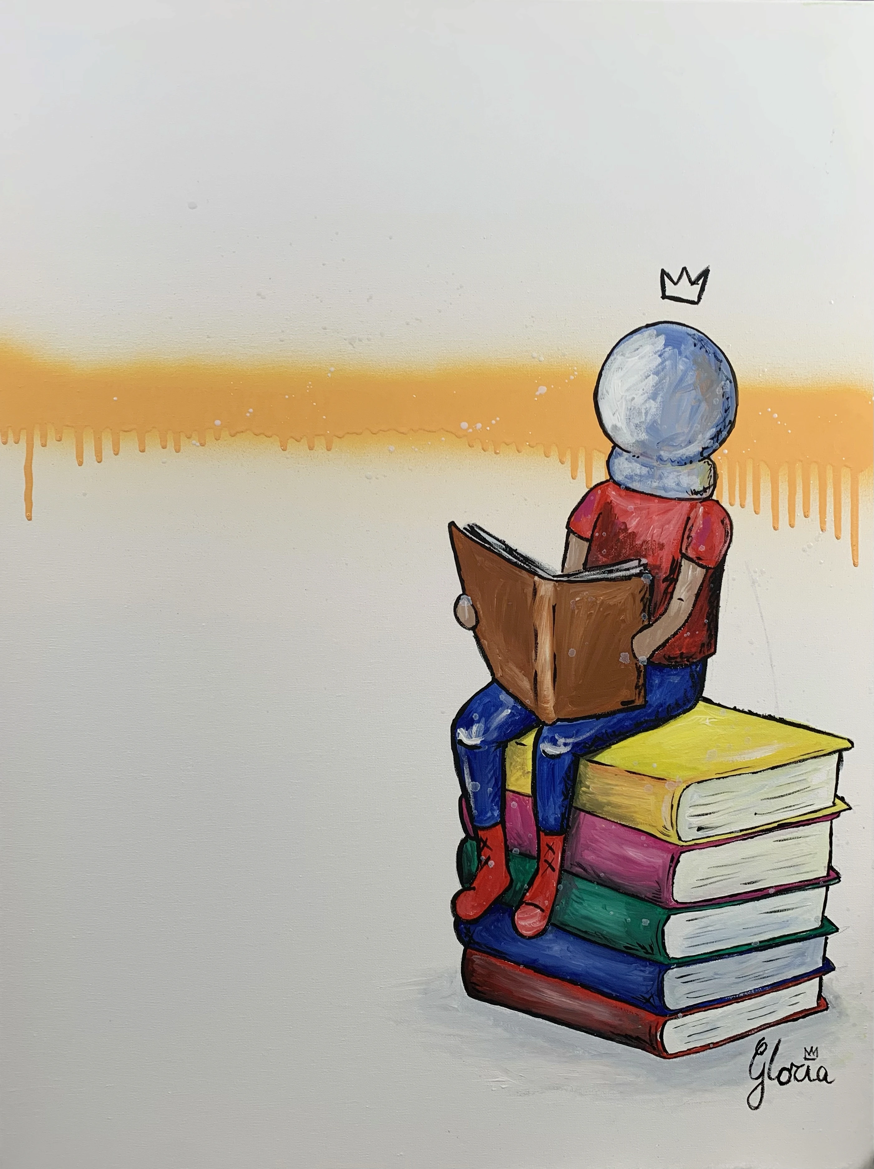 Un bubbleboy legge un libro seduto sopra una pila di libri. Rappresenta il potere della conoscenza e della fantasia che trascende i confini fisici.