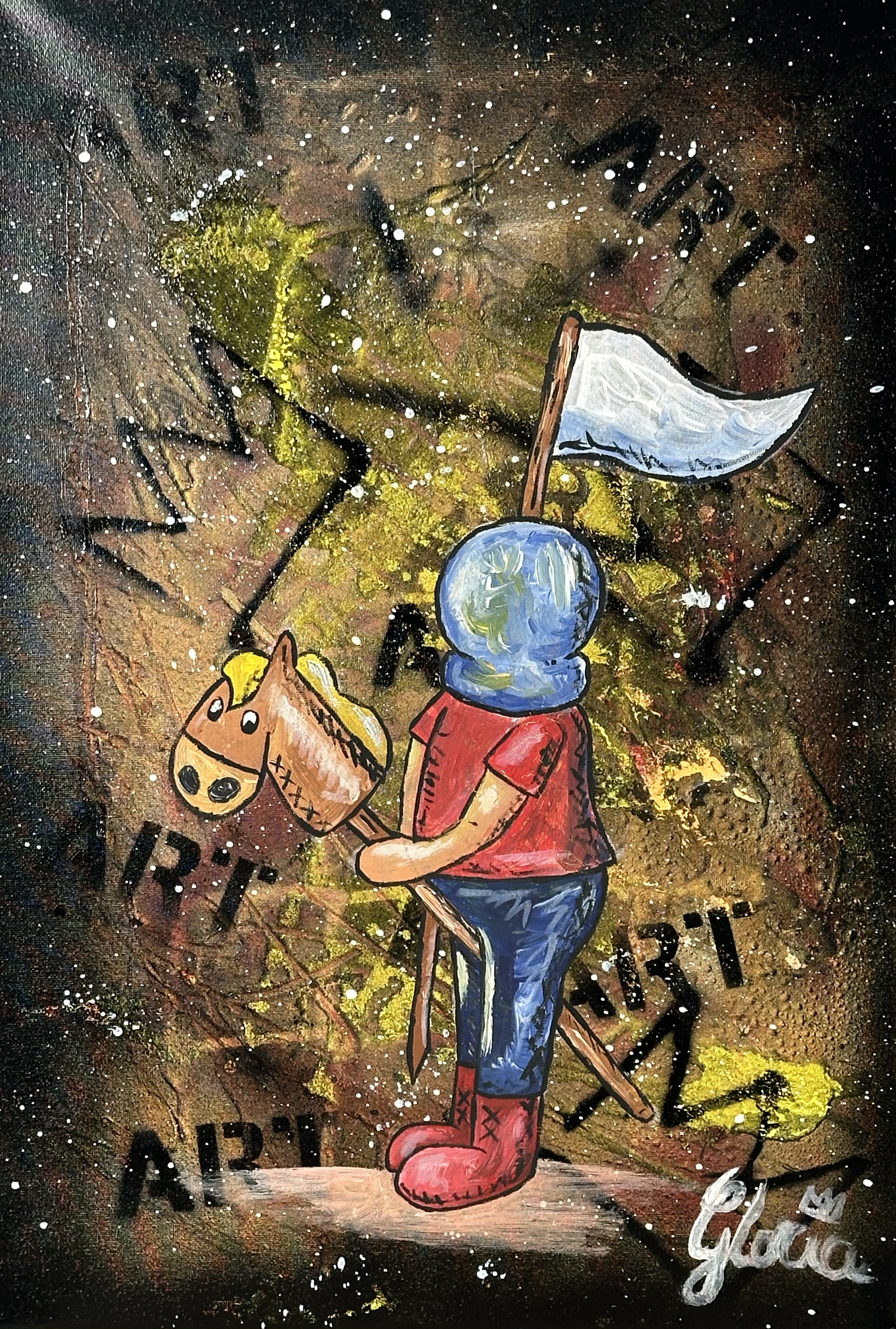 Durante l’esposizione ho chiesto ai visitatori di darle un nome, lasciando che fosse il pubblico a interpretare la scena: un BubbleBoy che cavalca un cavallo di pezza, come un gioco d’infanzia reinventato.